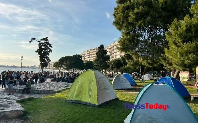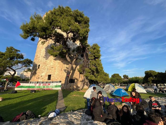 Θεσσαλονίκη: Φοιτητές στήνουν αντίσκηνα στον Λευκό Πύργο – «Η ιστορία έχει μια σωστή πλευρά – Με την Παλαιστίνη»