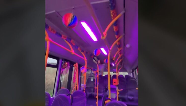 Αποκριάτικες μάσκες, σερπαντίνες και πολύχρωμα φώτα συνθέτουν το σκηνικό του λεωφορείου και δημιουργούν ένα εορταστικό κλίμα κατά τη διαδρομή.