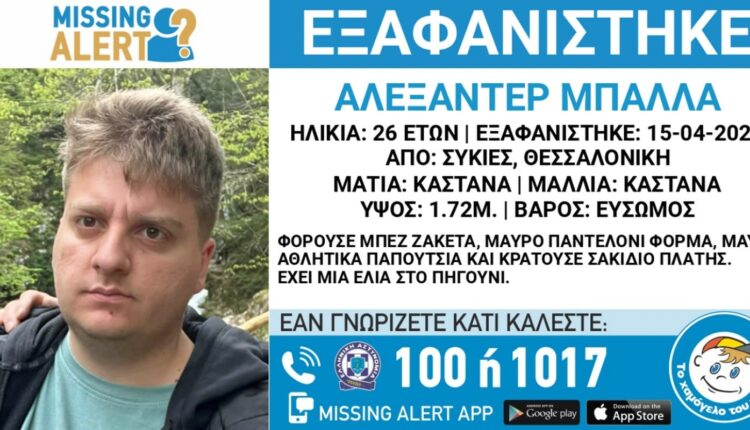 Συναγερμός σήμανε στη Θεσσαλονίκη μετά την εξαφάνιση του Μπάλλα Αλεξάντερ, 26 ετών, από την περιοχή των Συκεών. Το «Χαμόγελο του Παιδιού» γνωστοποίησε την υπόθεση και απηύθυνε έκκληση για πληροφορίες, καθώς υπάρχουν ενδείξεις ότι ενδέχεται να βρίσκεται σε κίνδυνο.