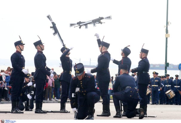 Με επιδέξιες κινήσεις κρατώντας στα χέρια τα όπλα τους, σε αρμονικό συγχρονισμό και άψογους σχηματισμούς οι σπουδαστές της στρατιωτικής σχολής Αξιωματικών Σωμάτων (ΣΣΑΣ), εντυπωσίασαν το πλήθος του κόσμου, που παρά τον άστατο καιρό, κατέκλυσε την πλατεία Αριστοτέλους στην Θεσσαλονίκη.