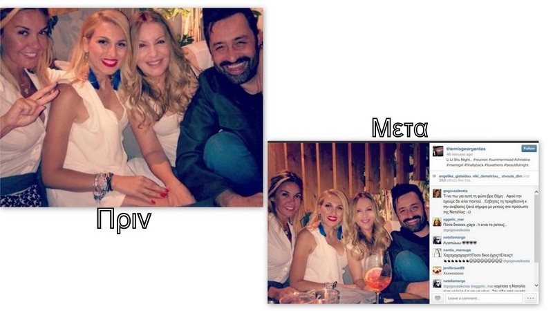 Τι έκανε ο Θέμης; Ο Γεωργαντάς λοιπόν, «ανέβασε» όπως σας προανέφερα μια φωτογραφία με την Γερμανού και την Σπυροπούλου. Όμως ξέχασε να κάνει ρετούς… για να κρύψει και τις ατέλειες της «20χρονης» Ναταλίας. Τώρα το ξέχασε… του έκανε θερμή παράκληση προκειμένου να κάνει ρετούς και μετά να την ποστάρει. Ποιος ξέρει. Και να πεις ότι ήταν και κανένα καλό ρετούς… κακό και πολύ πρόχειρο ρετούς…
