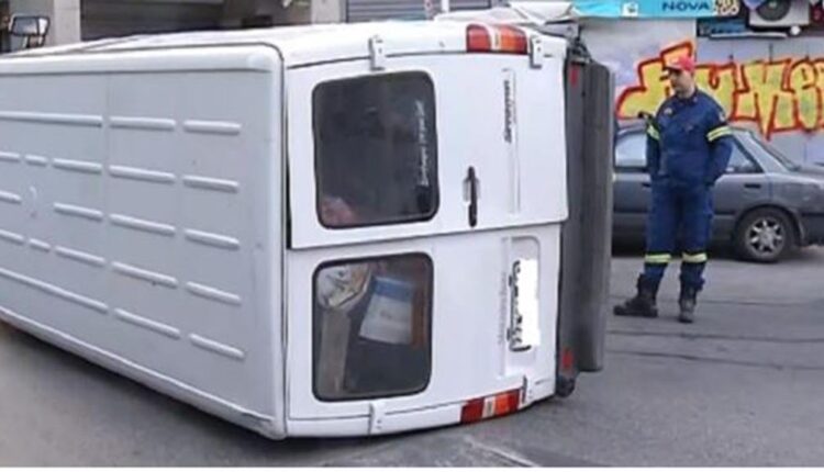 Φορτηγάκι παραβίασε κόκκινο σηματοδότη και συγκρούστηκε με αυτοκίνητο. Ευτυχώς δεν υπήρξαν τραυματισμοί, αλλά το φορτηγάκι αναποδογύρισε στο οδόστρωμα.