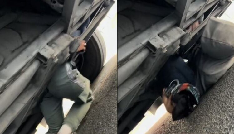 Οι εικόνες που καταγράφονται είναι επικίνδυνες και σοκαριστικές, καθώς οι μετανάστες είναι κυριολεκτικά σφηνωμένοι στον συγκεκριμένο χώρο που δεν υπάρχει πρόσβαση – πάρα μόνο κάτω από το λεωφορείο.