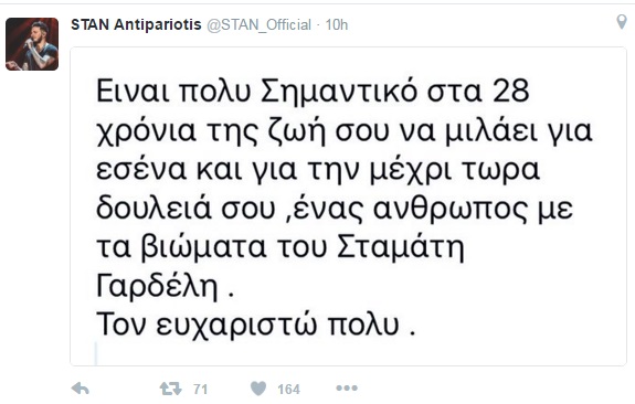 Αρχικά δημοσίευσε μία φωτογραφία από τη μεταμφίεση του Σταμάτη Γαρδέλη με την οποία φάνηκε να διασκεδάζει πολύ, ενώ στη συνέχεια ήρθε και το μήνυμα το στον προσωπικό του λογαριασμό στο twitter “Είναι πολύ σημαντικό στα 28 χρόνια της ζωής σου να μιλάει για εσένα και για την μέχρι τώρα δουλειά σου ένας άνθρωπος με τα βιώματα του Σταμάτη Γαρδέλη. Τον ευχαριστώ πολύ”.
