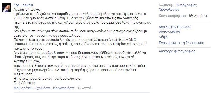 Η Ζωή Λάσκαρη έγραψε ένα κείμενο στο facebook για τον Γιώργο Παπανδρέου.